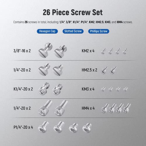 NEEWER 26PCS Camera Screw Set for Photography Equipment, Includes 1/4″ 3/8″ M2 M2.5 M3 and M4 Screws Compatible with SmallRig Camera Cage, Top Handle, Side Handle Grip, Tripod QR Plate, UA002